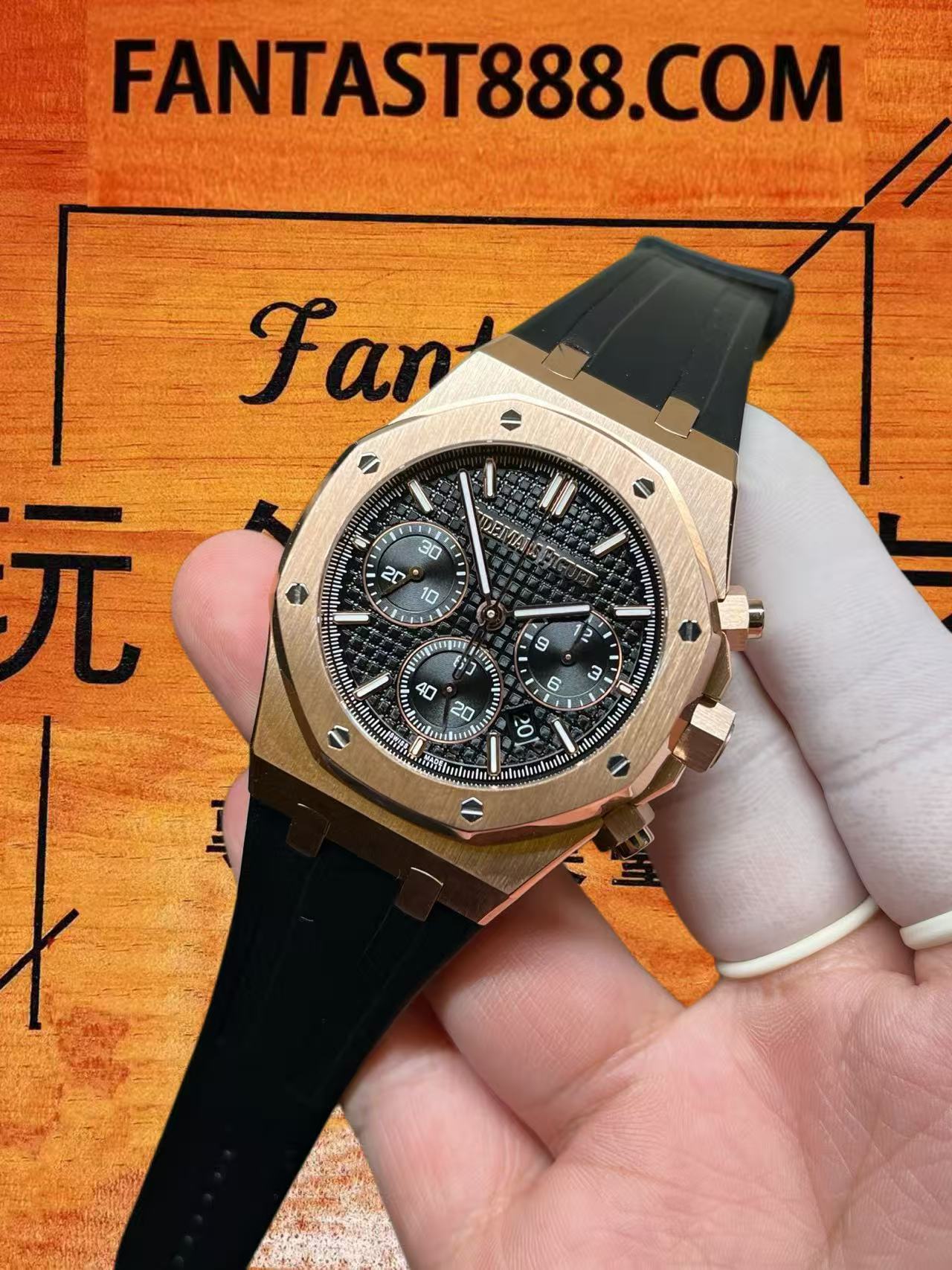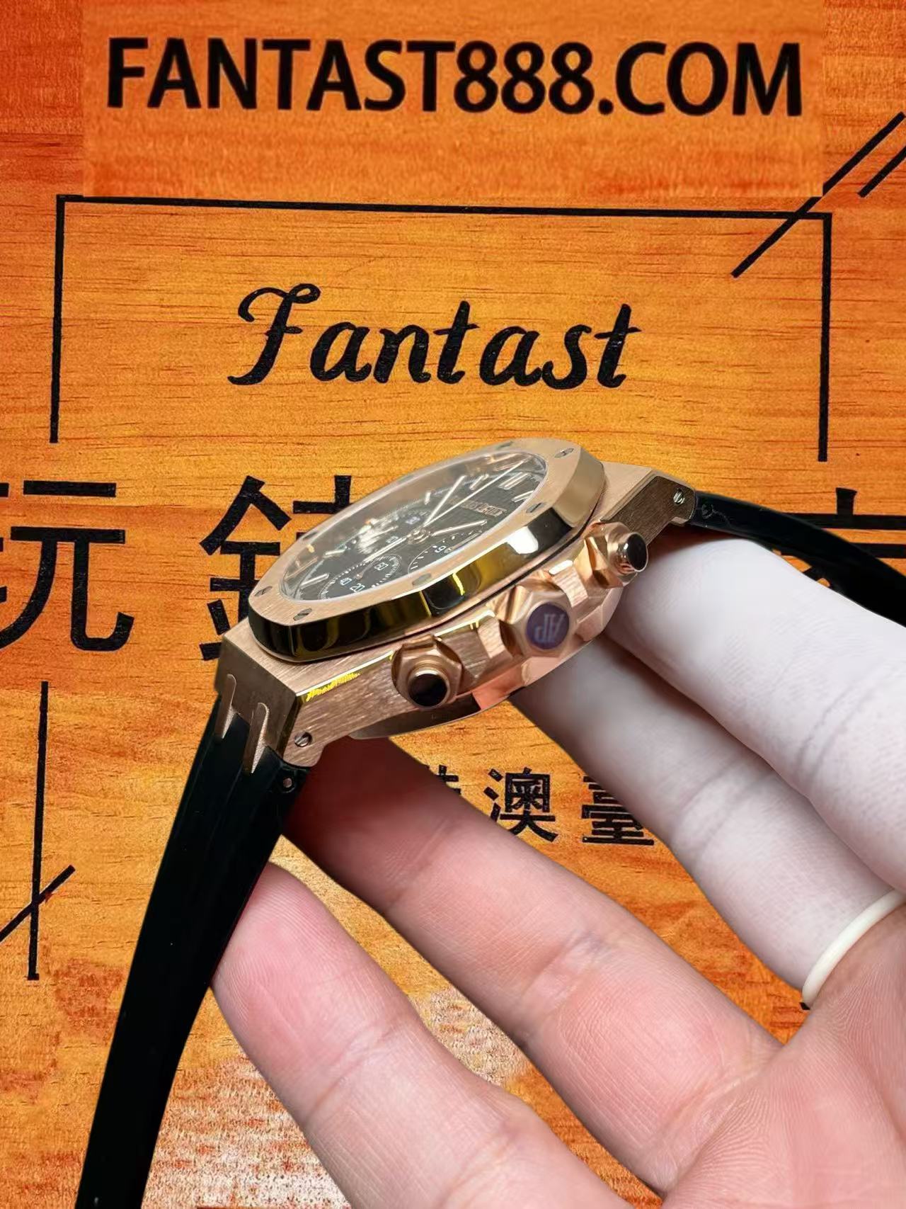 回歸正題,本次重點在於左側這兩枚26240型號,以及右側這枚玫瑰金材質的26240款式。兩者的風格差異頗為明顯,主要體現在面盤設計、按鈕造型以及錶冠樣式上。左邊兩款屬於離岸型設計,右側則為經典款式。APS廠製作的離岸版本已具有相當高的完成度,其面盤的格紋處理相較於普通版本更為簡約,不像26240等普通款式需要更為複雜的工藝。正因工藝相對簡化,其在細節呈現上往往更為出色。灰色面盤未見明顯色差,同時搭配灰色陶瓷錶圈。藍色面盤款式,大家最關心的莫過於色差問題,由於其藍面工藝並不複雜,加上廠家調色較為準確,肉眼觀察下色差極其輕微,幾乎難以察覺。紅色計時指針的色澤也處理得相當漂亮,個人認為沒有太大問題。