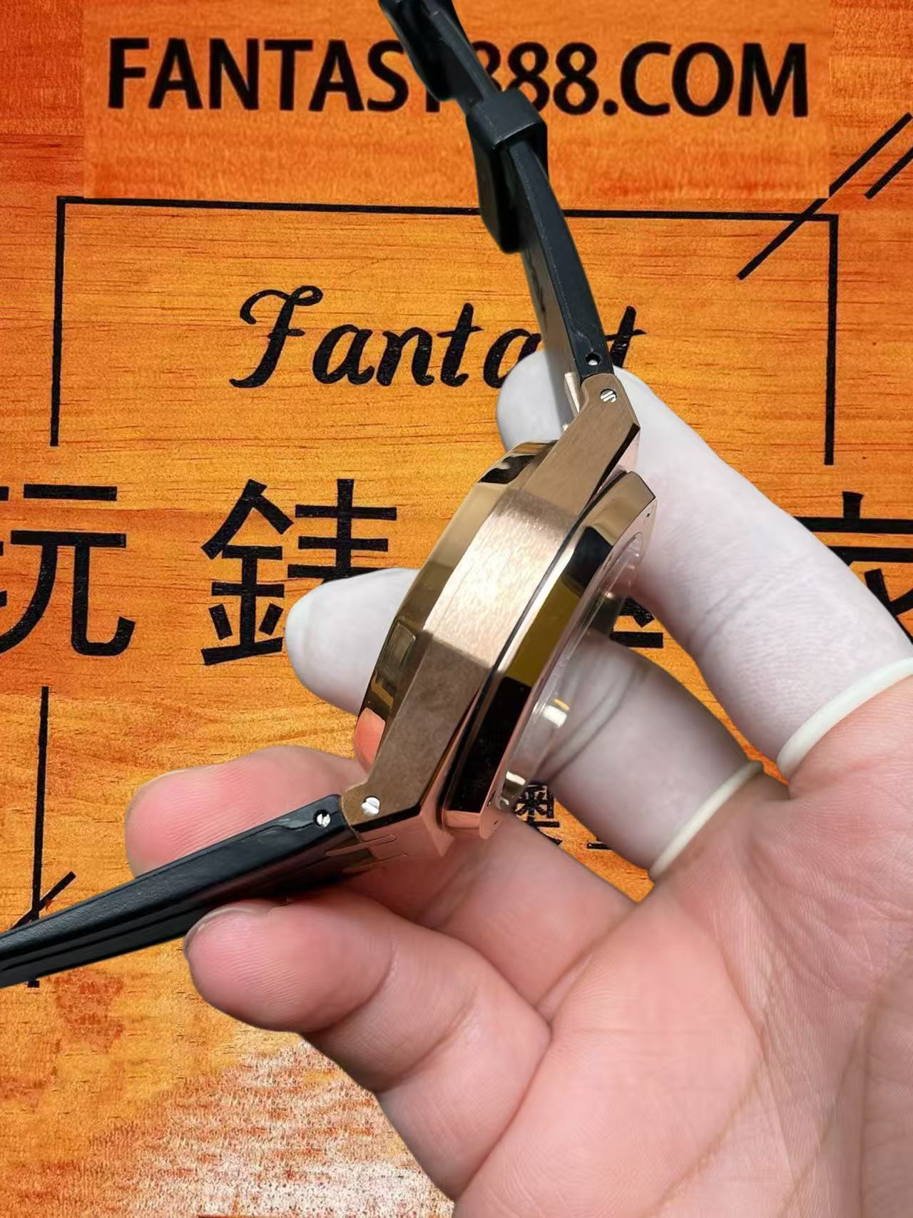 再看這枚26240款式,其面盤是非常經典的巧克力色放射紋,三個副錶盤外圈為玫瑰金色,搭配藍色面盤的效果十分出眾。當然,此藍面或多或少仍存在些許色差。觀察整體錶殼,離岸型26240的錶殼視覺上更為厚實,側面點綴有陶瓷材質部件,包括陶瓷按鈕以及錶冠上的陶瓷環。如前所述,其殼身相對較厚。而26240的殼身表現則更為纖薄,由於是玫瑰金款式,其不鏽鋼錶殼經過了電鍍處理,整體重量自然不及貴金屬材質。若偏愛運動風格,26240款式是合適的選擇。