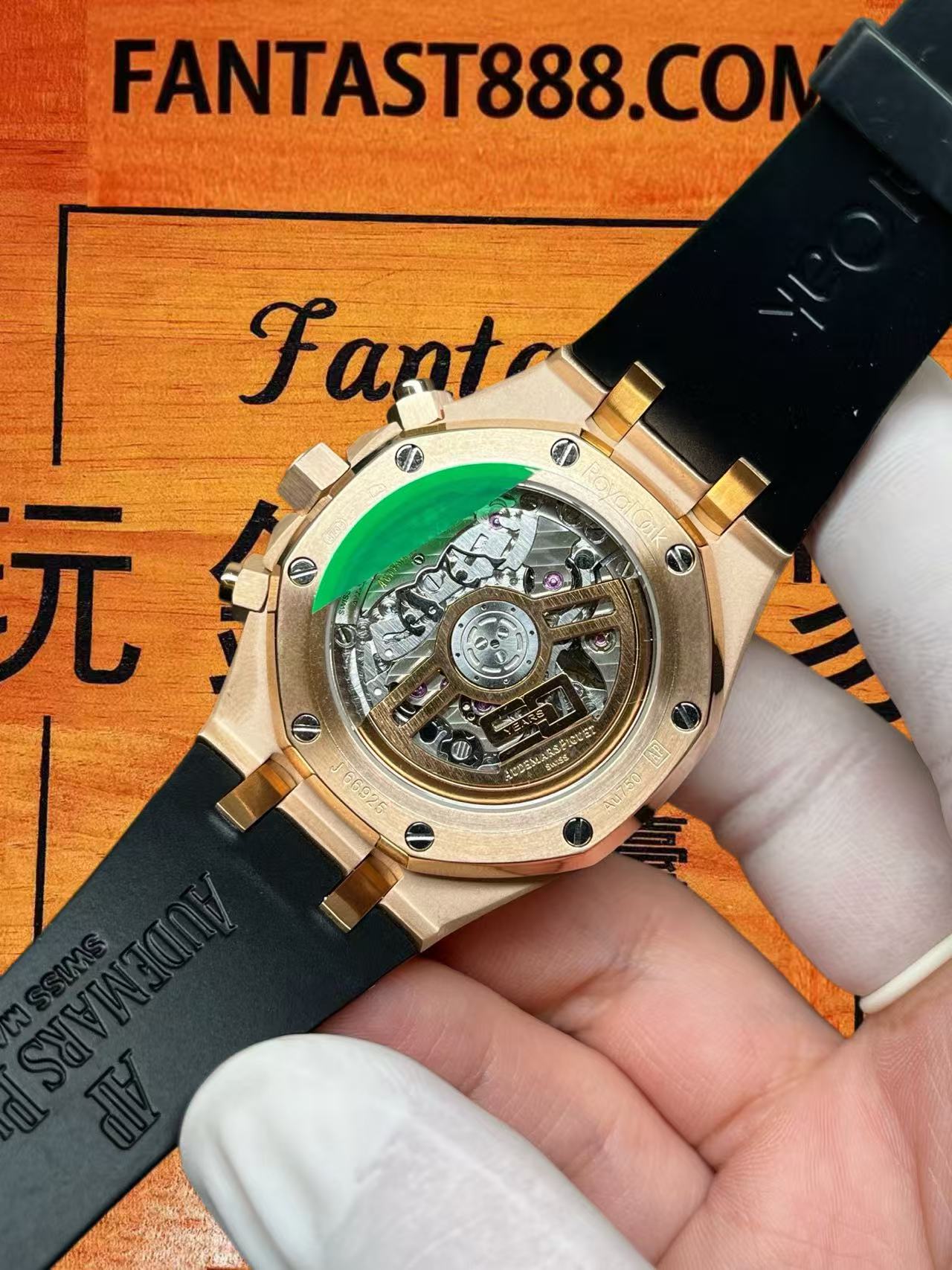 兩者搭載的機芯均為上海4401型機芯,主要區別在於離岸款的自動陀並非金色。上海4401型飛返計時機芯有兩個版本,手頭這枚為隱藏卡度版本,另有一款真無卡度版本,後者成本更高。26240款式的機芯主要差異在自動陀顏色,內部結構大體相同,計時功能一致,均為飛返計時,調校方向與日曆跳轉方式亦與原版相同。此枚機芯在愛彼系列中穩定性較高,優於3130機芯,也優於上海4302機芯。滿鏈狀態下動力儲存接近七十小時,但通常不建議上滿鏈條,以免對發條造成損耗。調校時間後務必擰緊錶冠,以確保防水效果。