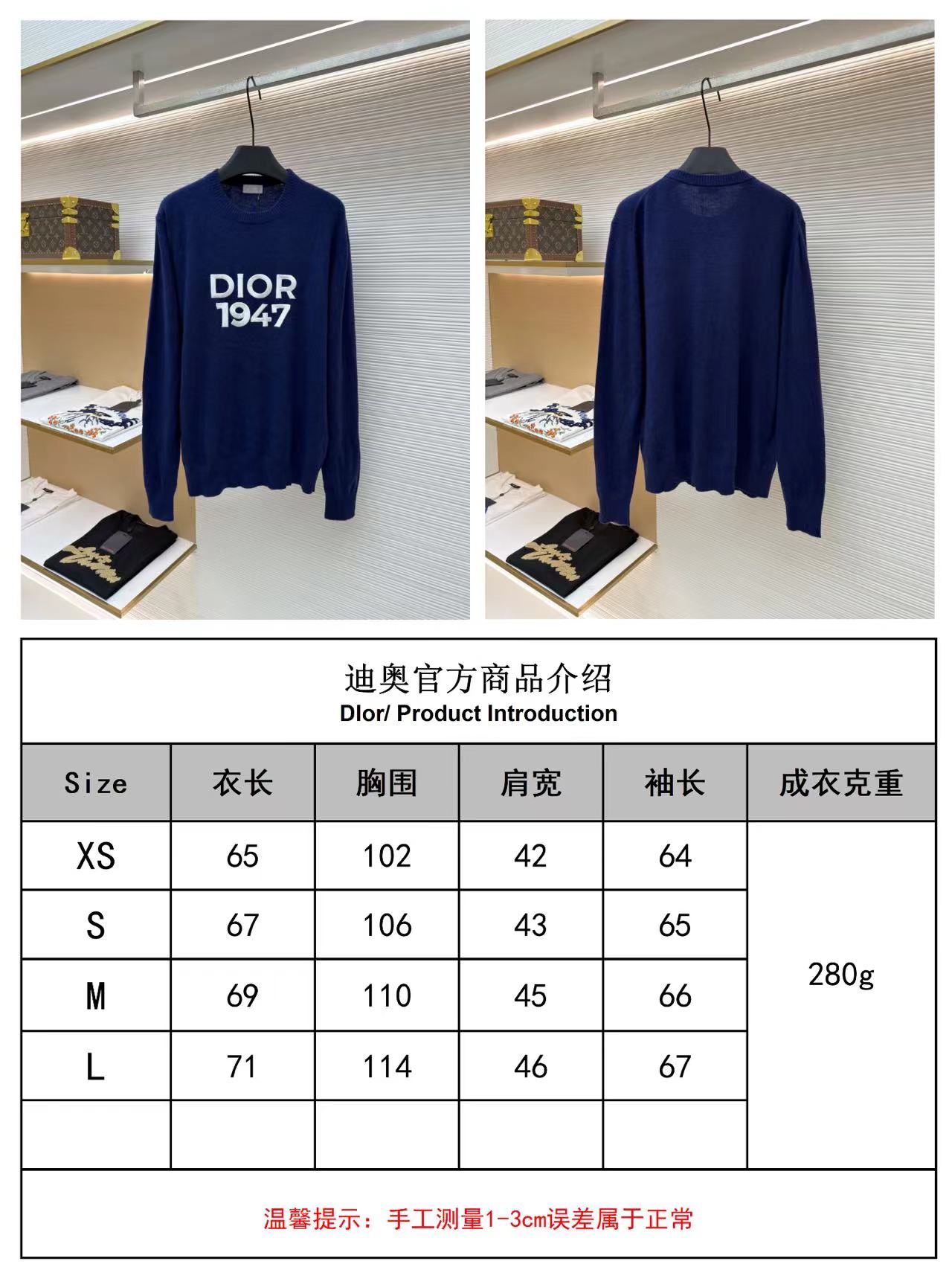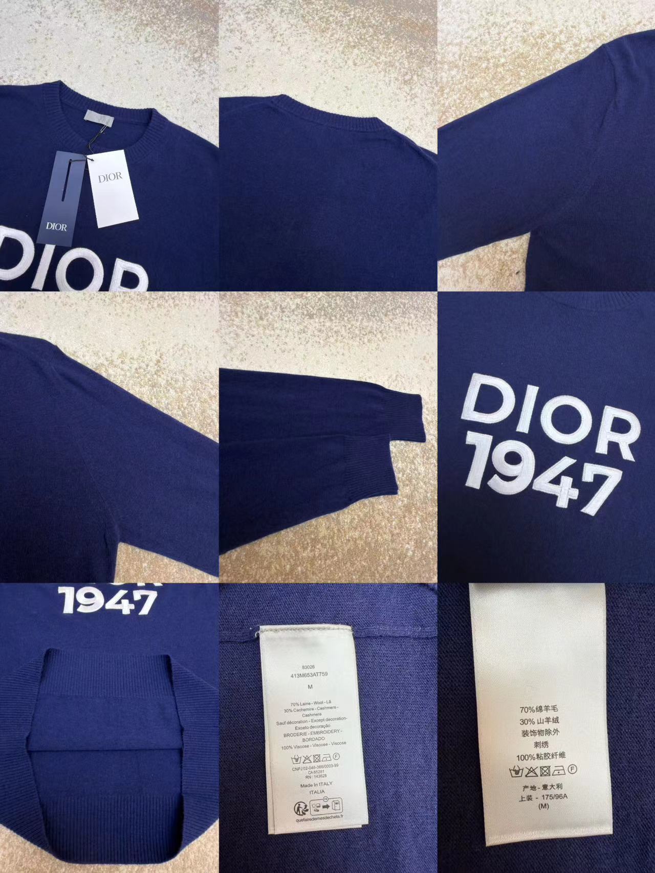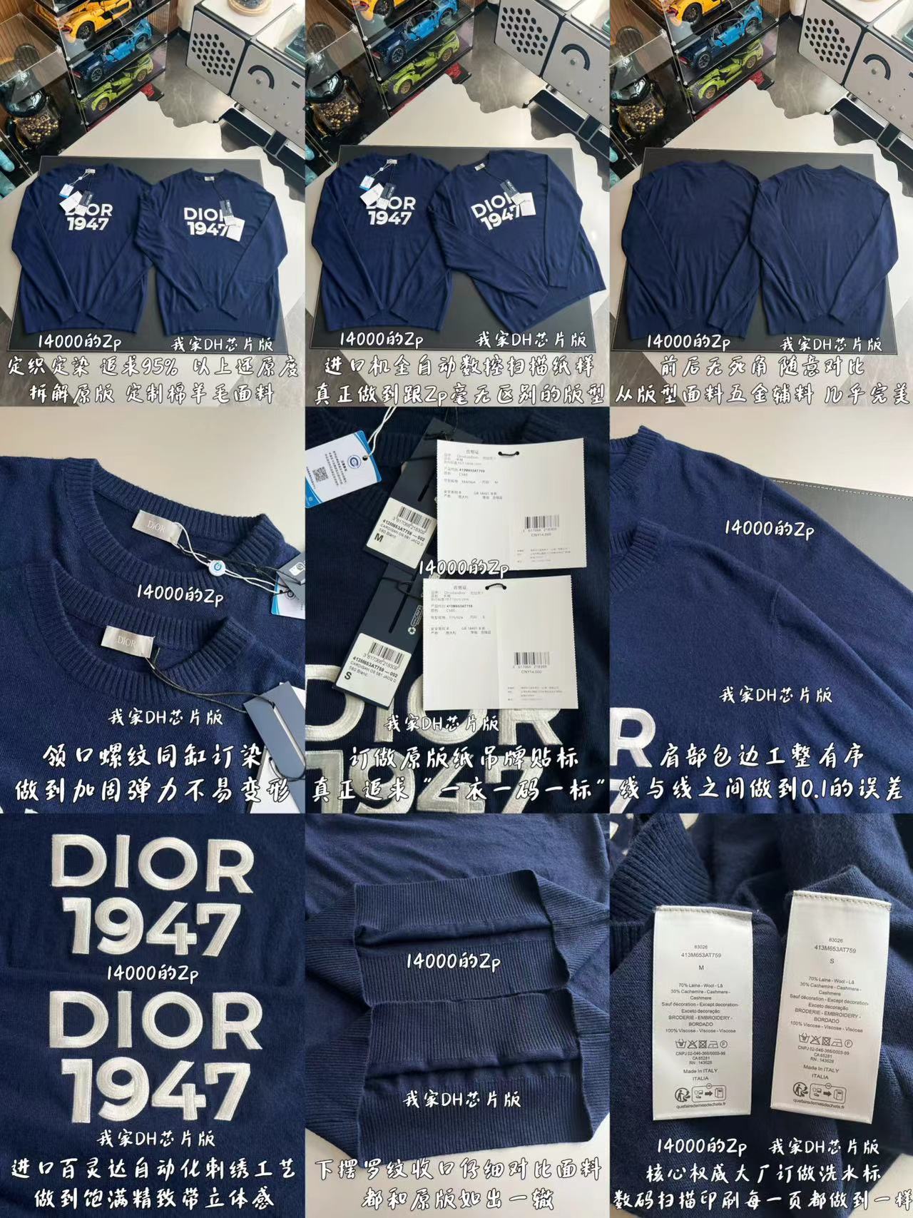 名稱是1947繡花打底毛衣。面料為羊毛混紡,屬於臻品山羊絨級別。整體克重大約兩百八十克,屬於輕磅打底款式。工藝核心在於手寫體刺繡。顏色為藍色,經過定染打色處理,與原版相似度達百分之九十五以上。版型為合身打底設計。尺碼範圍從XS到L。輔料包括定制的三種標籤,即領標、洗滌標與吊牌。參考價格為人民幣一萬四千元。簡而言之,這是一件以頂級面料說話的日常打底衫,刺繡是畫龍點睛之筆,羊絨則是其靈魂所在。根據官方類似款的資訊,Dior 1947系列通常採用百分之七十羊毛與百分之三十羊絨的配比,並以十二針中等厚度織成。
