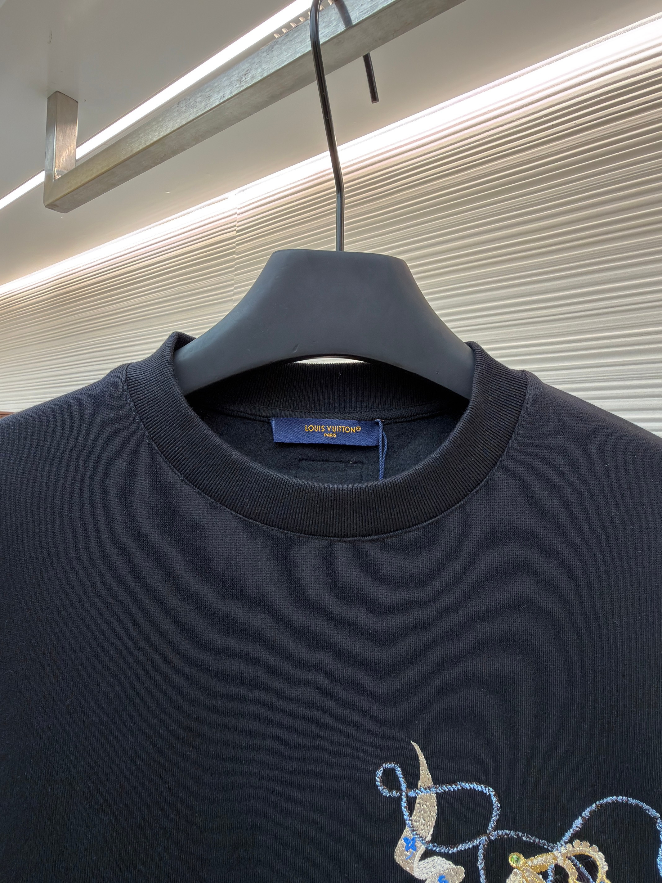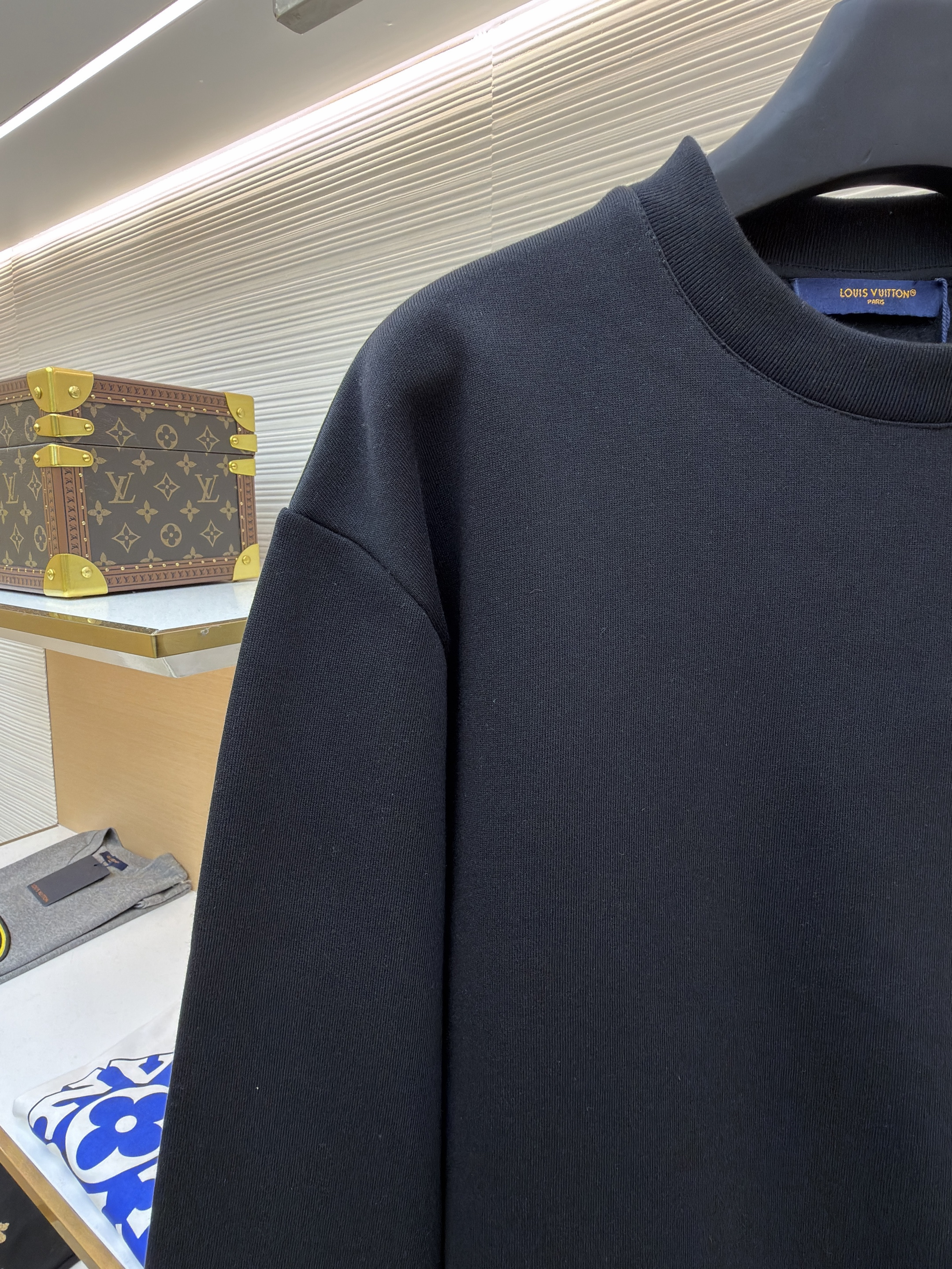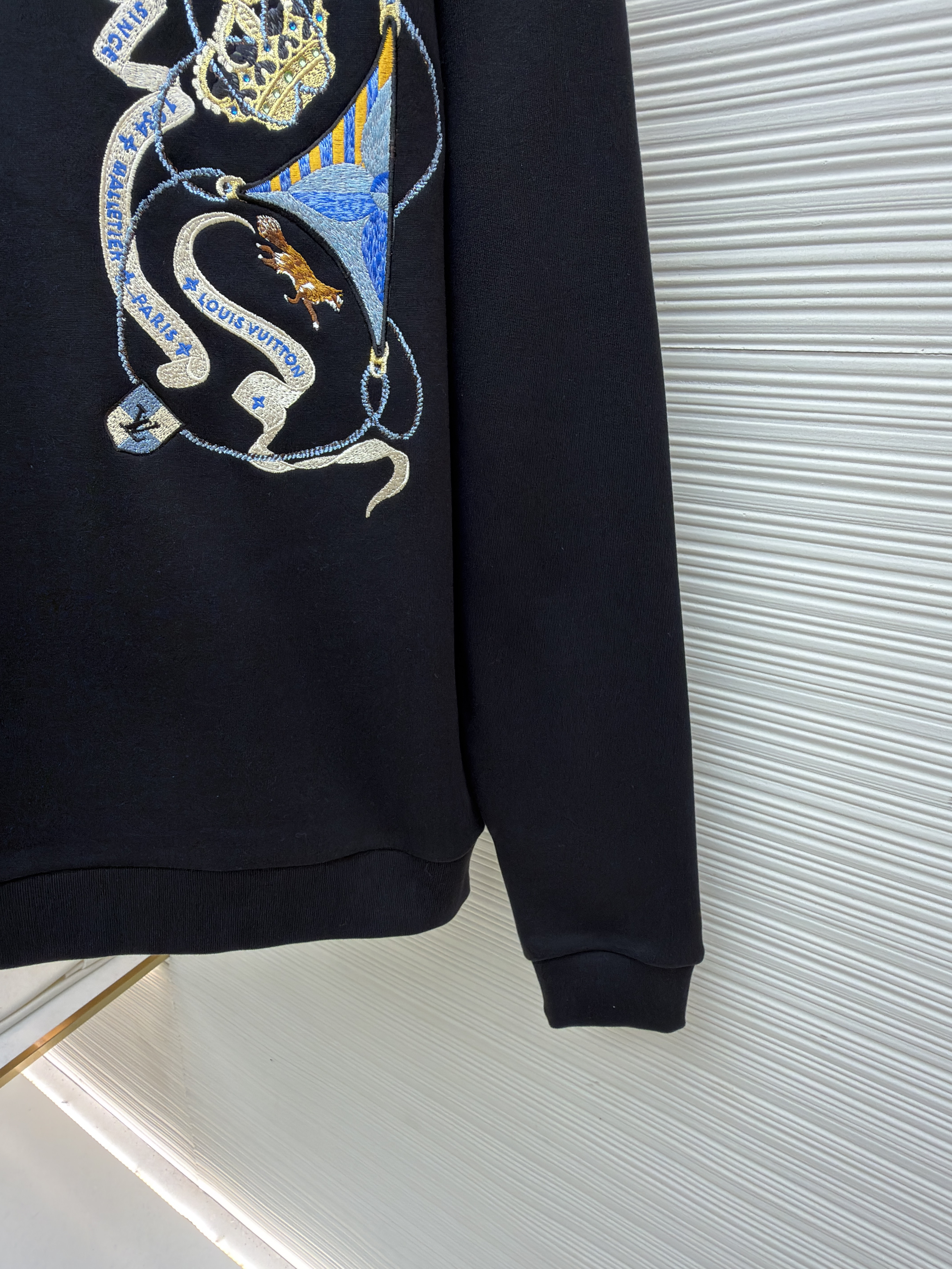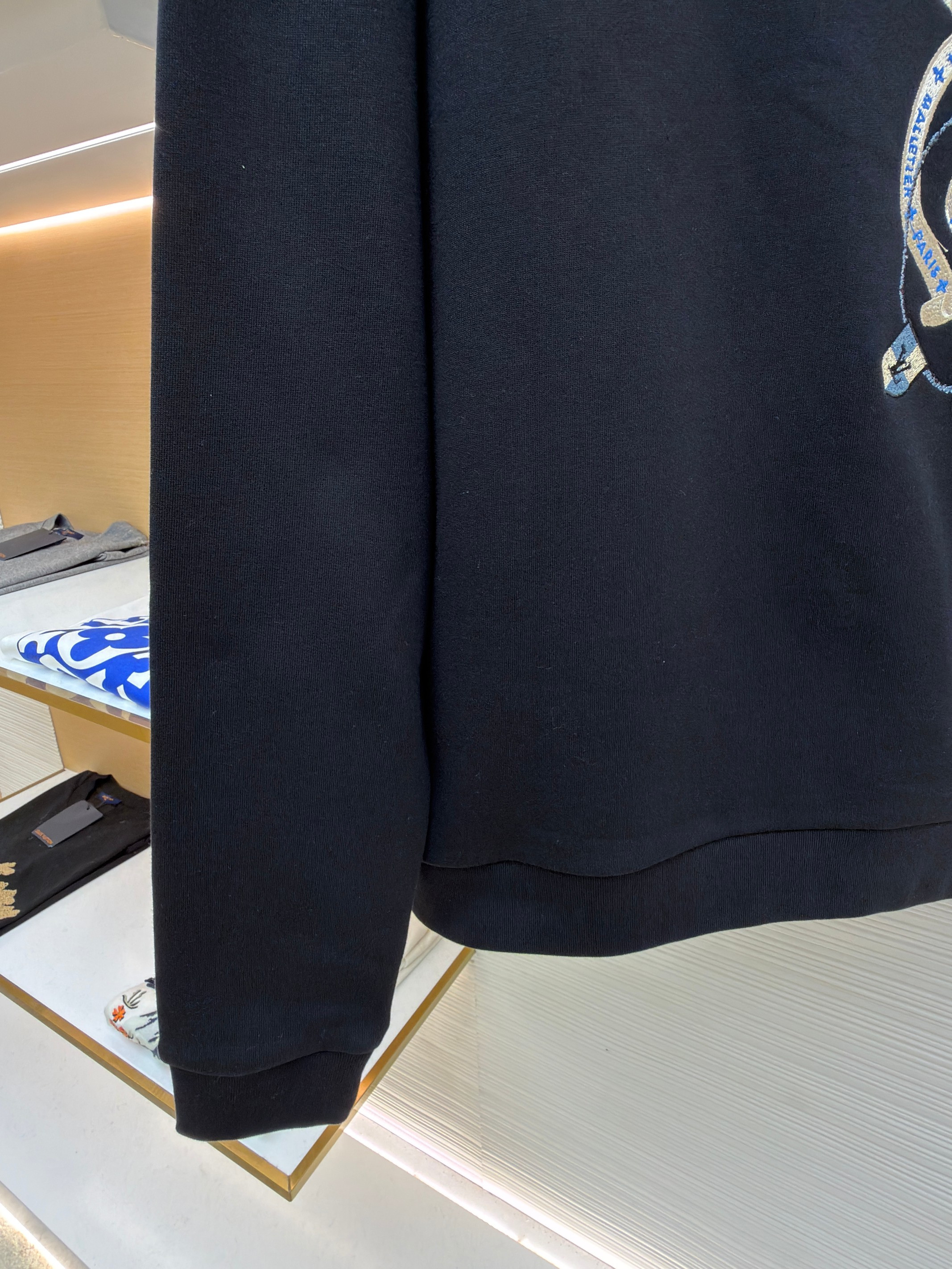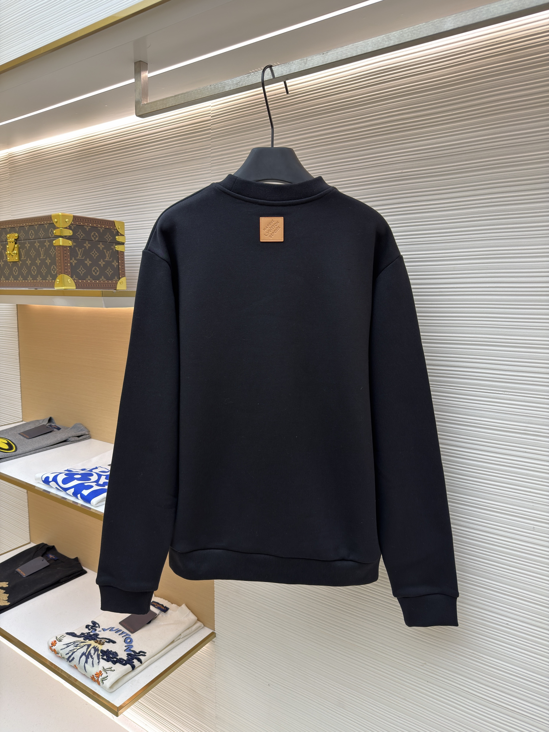 粗針刺繡工藝為本品亮點:前後身品牌標識通過粗線刺繡呈現,針腳均勻密實,模擬手工編織的立體視效。這種工藝常見於正品高端線衛衣設計,如LV經典Monogram系列中的刺繡細節,本品在此基礎上強化線條粗細對比,使標識更具視覺衝擊力。