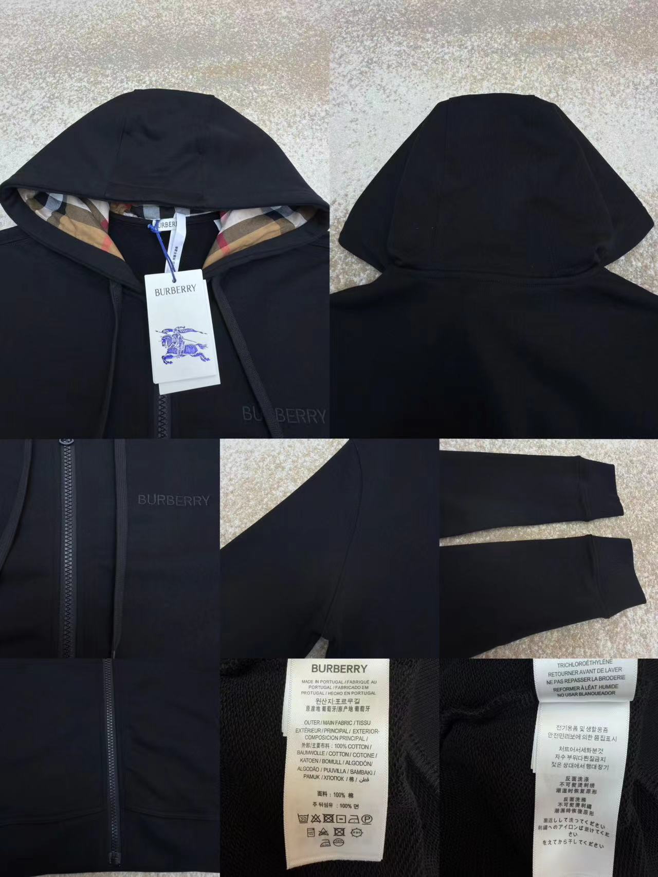 設計上,衛衣以刺繡LOGO為重點,強化品牌的標識性語言。LOGO元素源自Burberry經典徽標,自品牌創立以來便成為識別核心。刺繡部分採用進口平繡技術,線條清晰且邊緣平整,展現對細節的堅持。刺繡透過高密度針腳與高色牢度繡線,塑造出立體而飽滿的圖案效果,確保反复洗滌後仍保持鮮明度。連帽內側拼接品牌經典格紋面料,透過手工對位拼接工藝,格紋圖案對齊誤差控制在極小範圍內,展現品牌對精準度的追求。