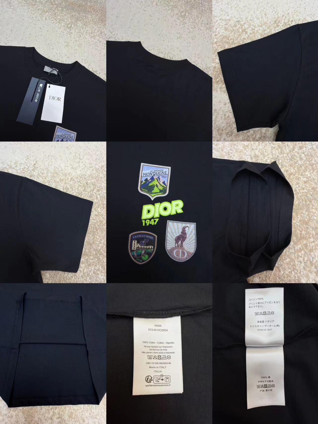 設計上,短袖以高山圖案與經典標識為重點,呼應迪奧對自然主題的探索。胸前印花透過白墨直噴技術實現,該技術能在深色面料上呈現鮮明且不透明的色彩效果。圖案邊緣清晰,觸感平整,避免傳統印花可能產生的僵硬感。經典標識以補丁形態結合熒光綠撞色字母,再以貼布繡工藝精準縫合於面料之上。這種技術要求對位精準,確保立體感與色彩飽和度符合品牌標準。