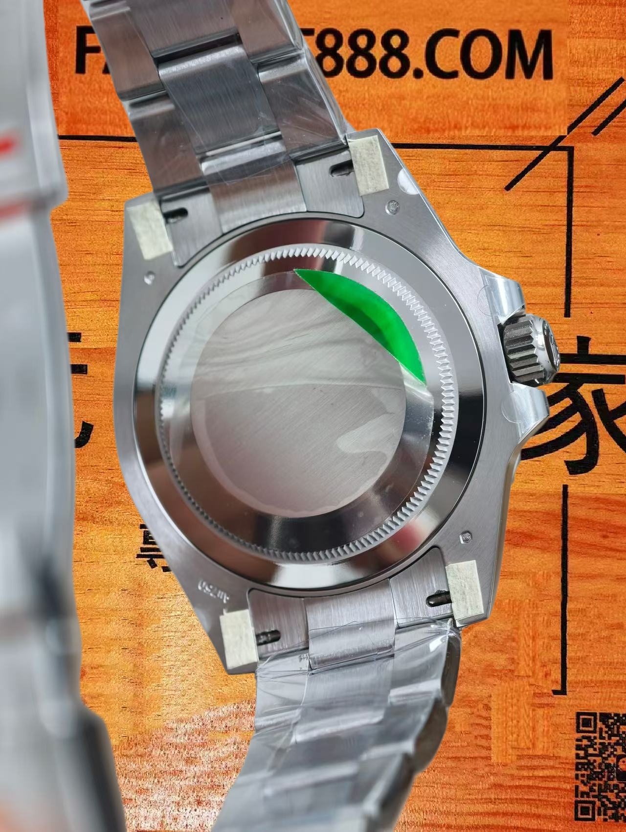 錶圈為陶瓷材質,屬於V3版本。旋轉手感緊實且帶有適中阻尼感,操作體驗良好。圈口上的皇冠標誌對位準確。錶殼採用鎢鋼與不鏽鋼複合材質,並已進行配重處理。錶冠上的貴金屬標記為一橫槓,左右兩側各有一圓點,此為貴金屬款式的專用標記,與普通不鏽鋼可樂圈的標記有所不同。錶殼側面及底蓋上的刻字,如AU750、狗頭標、天平標等,均為深刻工藝,清晰而深刻。
