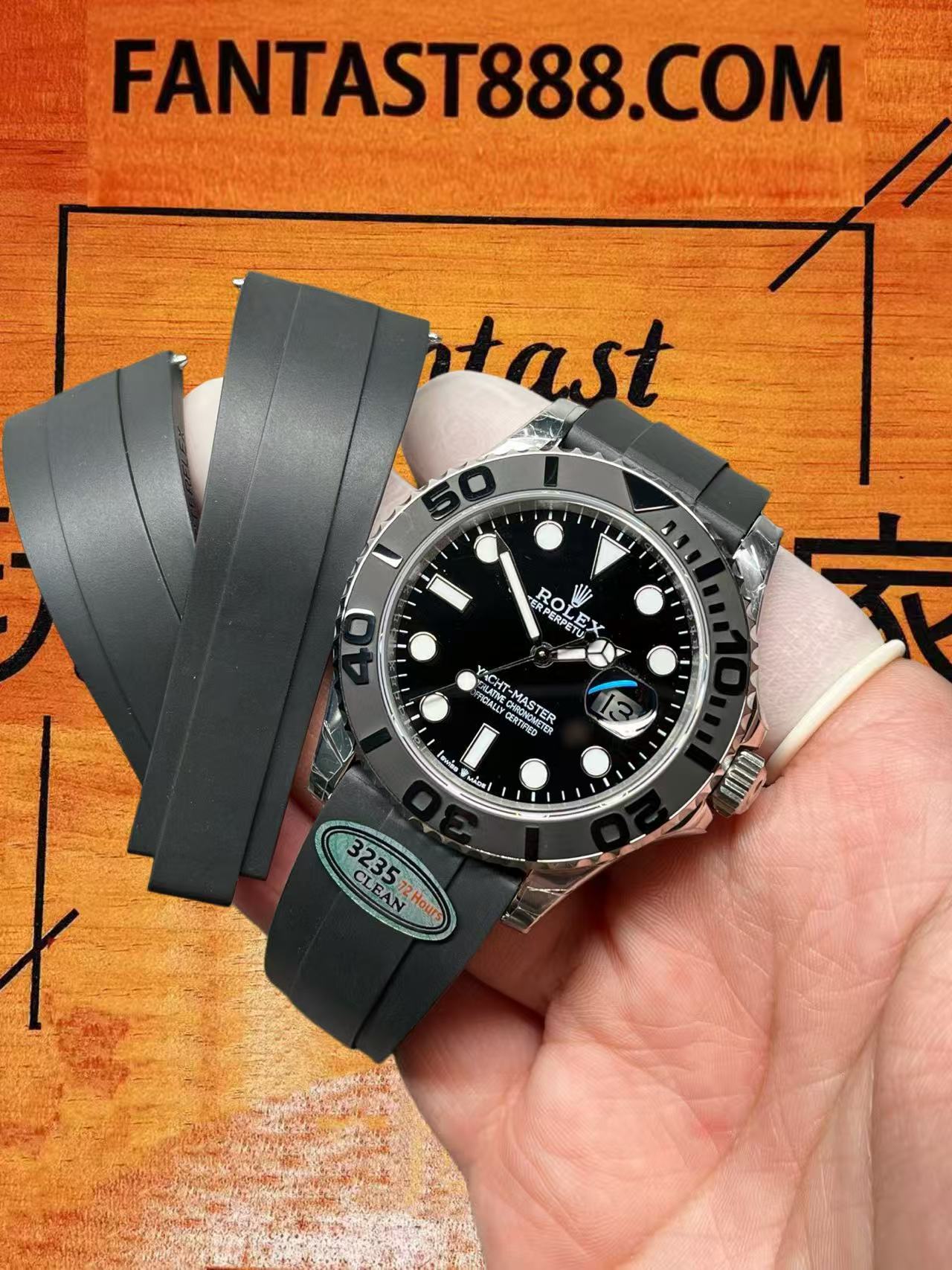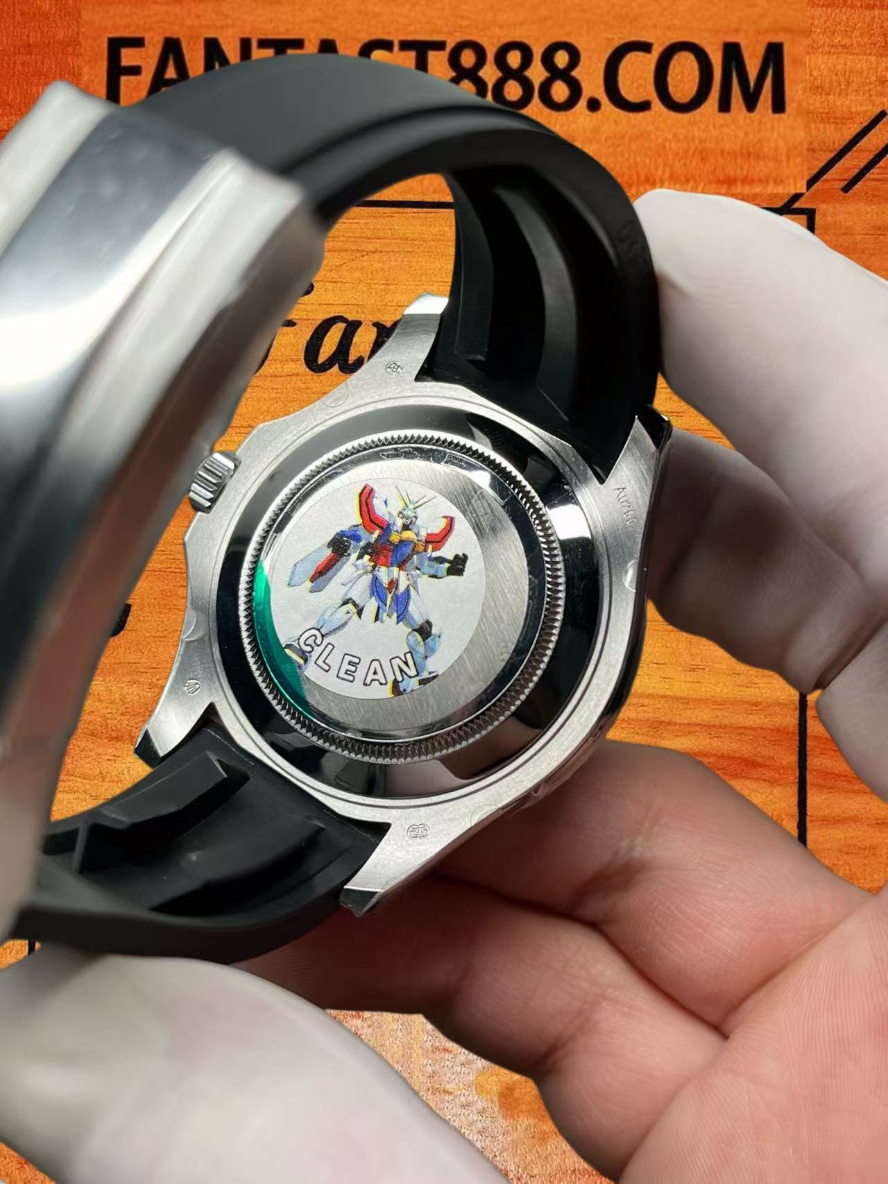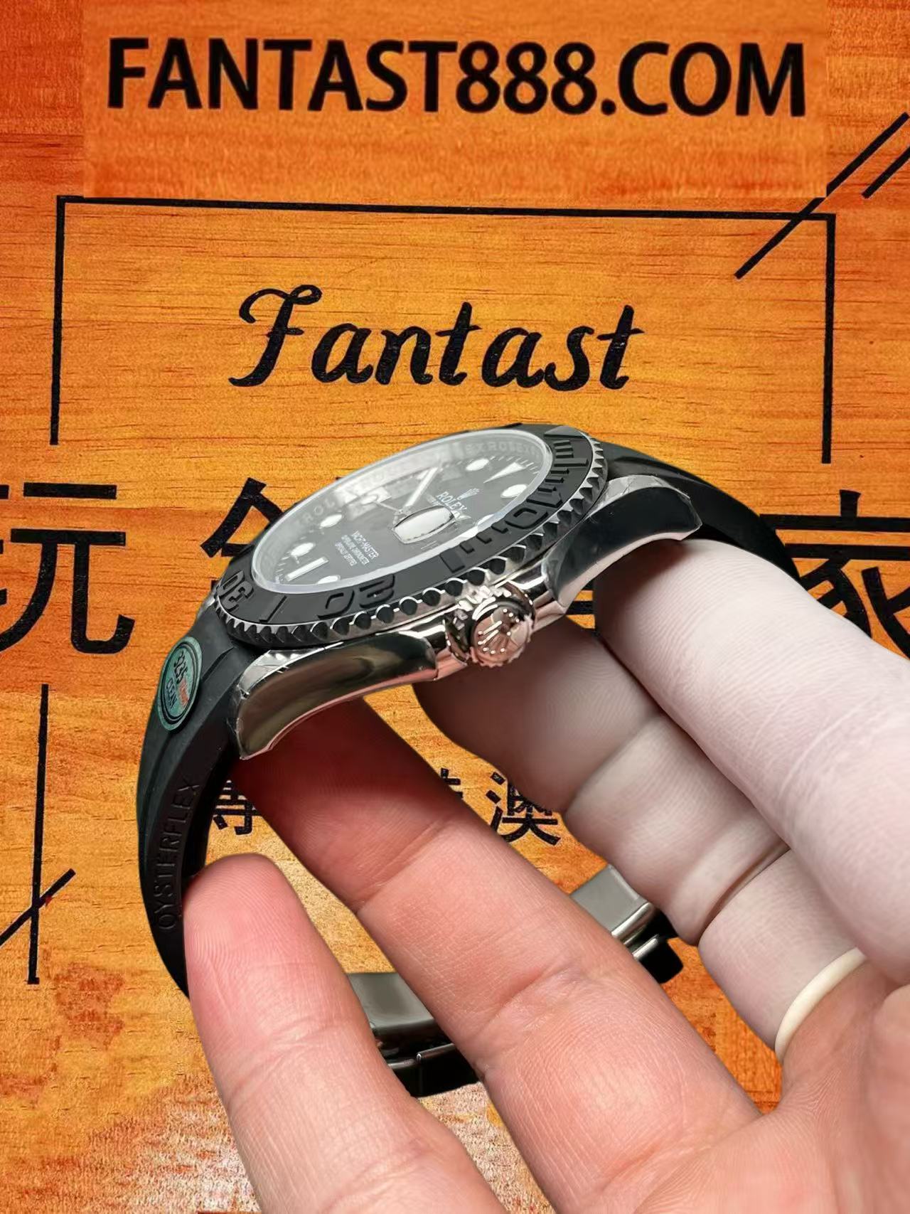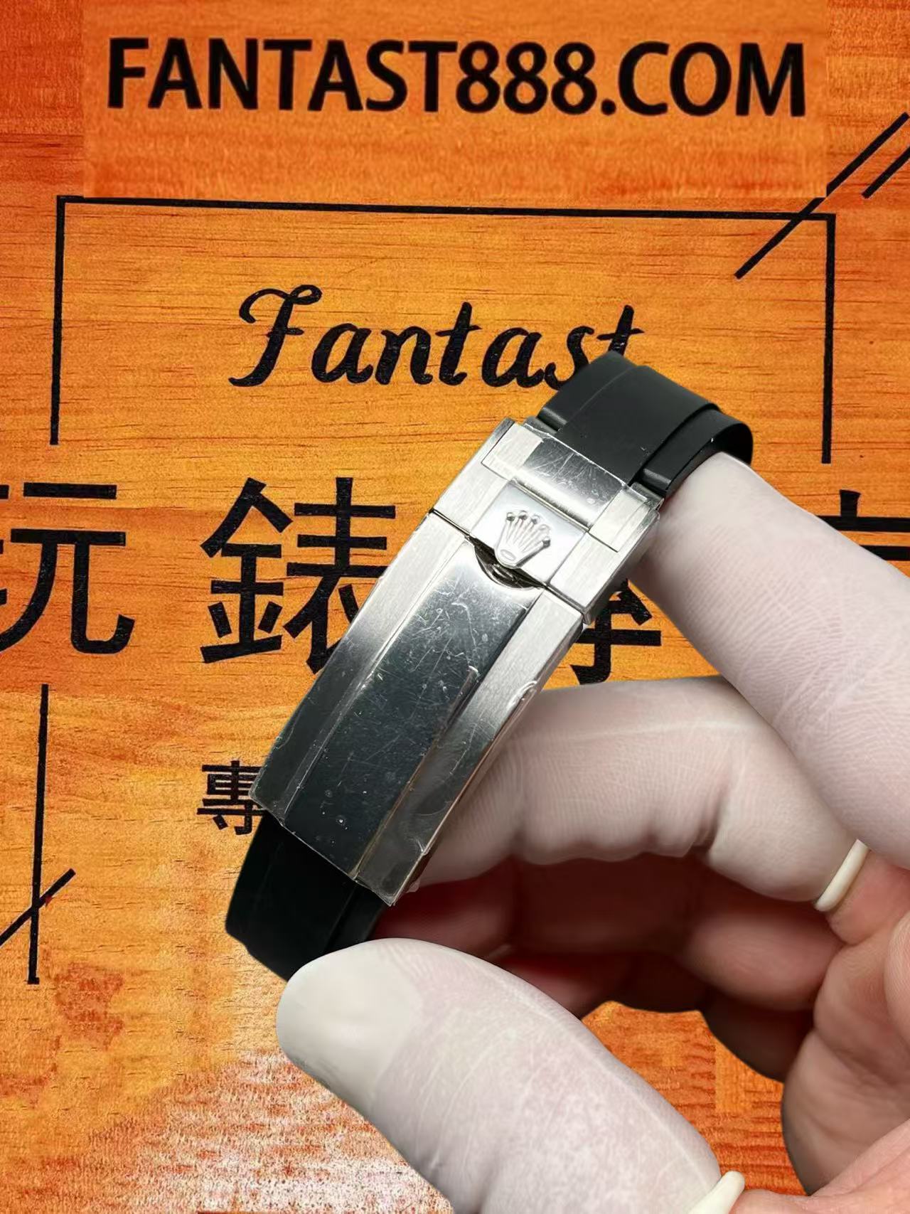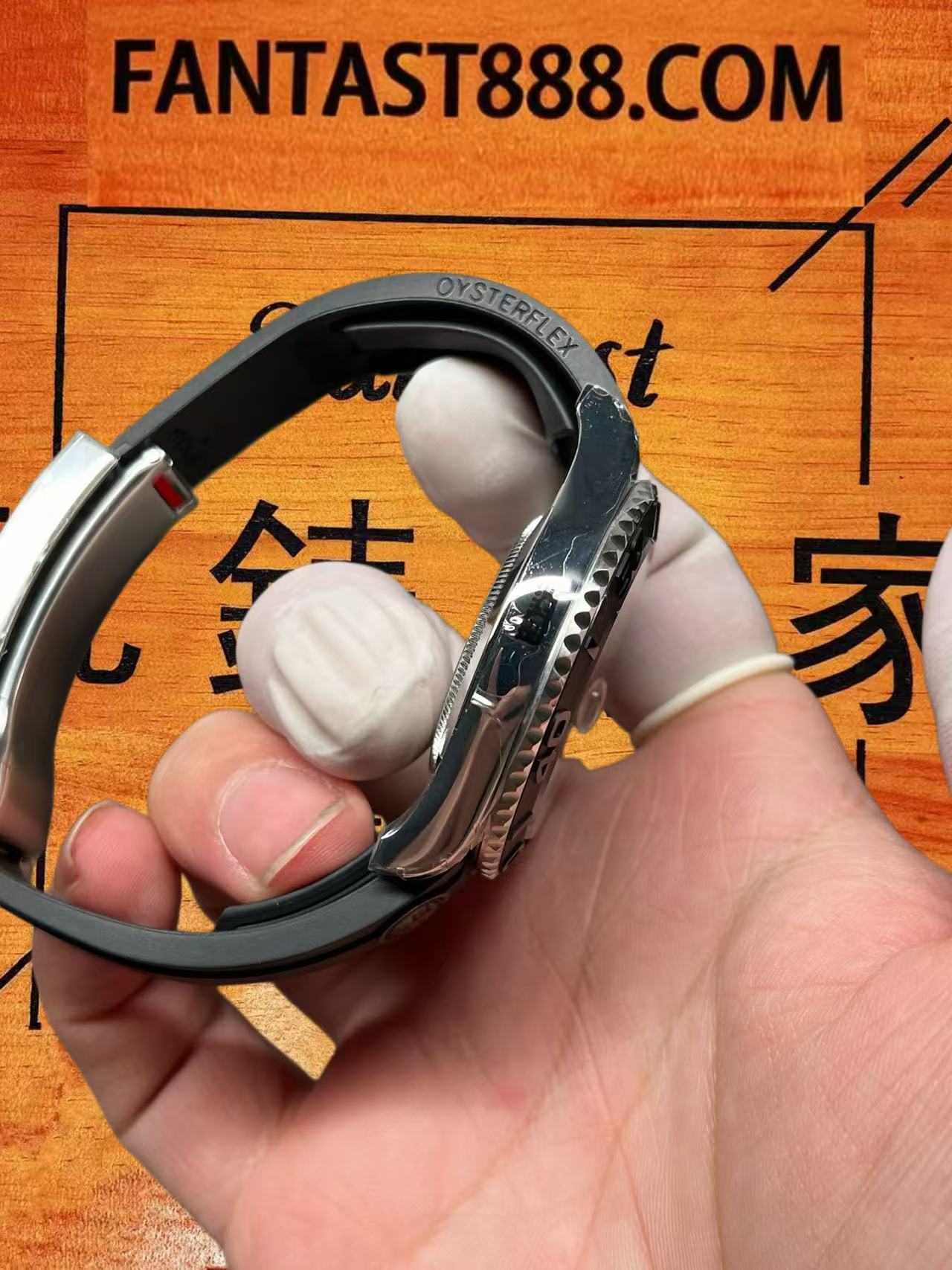 錶冠上的皇冠標誌立體感佳,防偽細節清晰可見,為橢圓形輪廓。錶圈的牙圈(狗牙圈)觸感順滑,打磨精細,不會有刮手感。錶帶部分,原廠配備的是F加D加D規格的膠帶,其最大尺寸適合手腕圍約十八點五公分的佩戴者。若手腕尺寸不同,則需另行選購合適的膠帶。錶扣具備滑動式快速調節功能,與原版同步。內部刻有編碼WT,開合手感良好,皇冠標誌立體清晰。