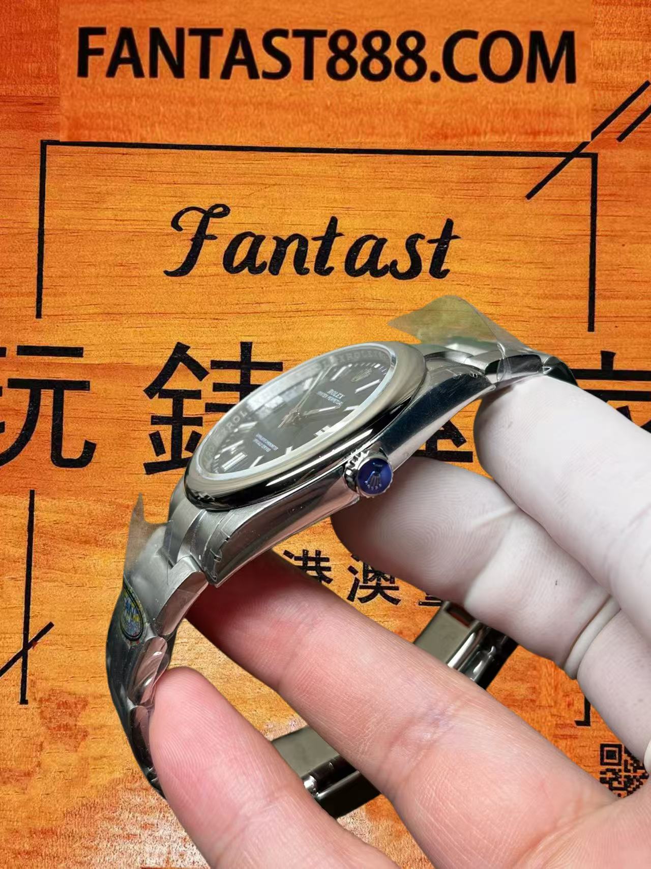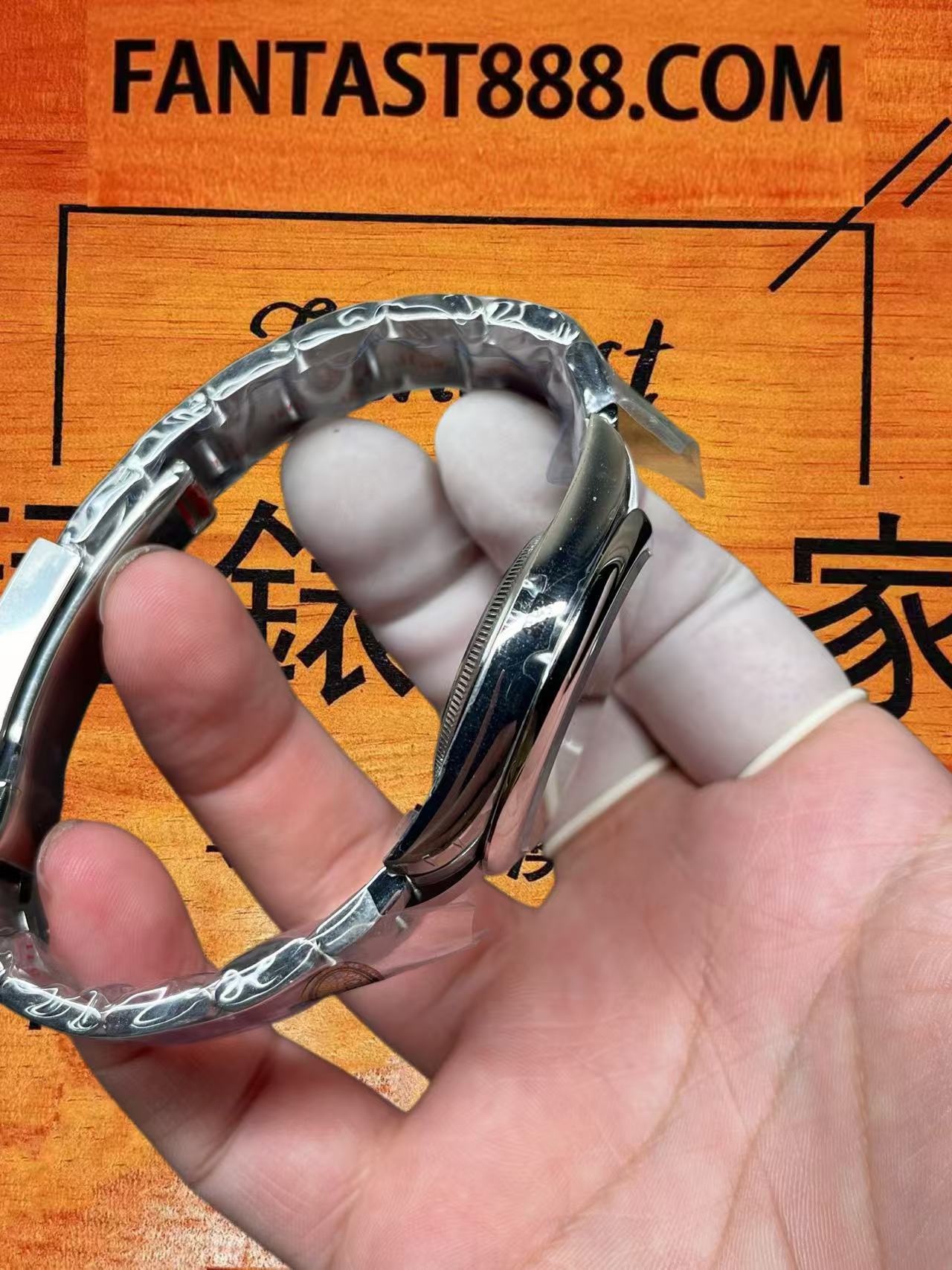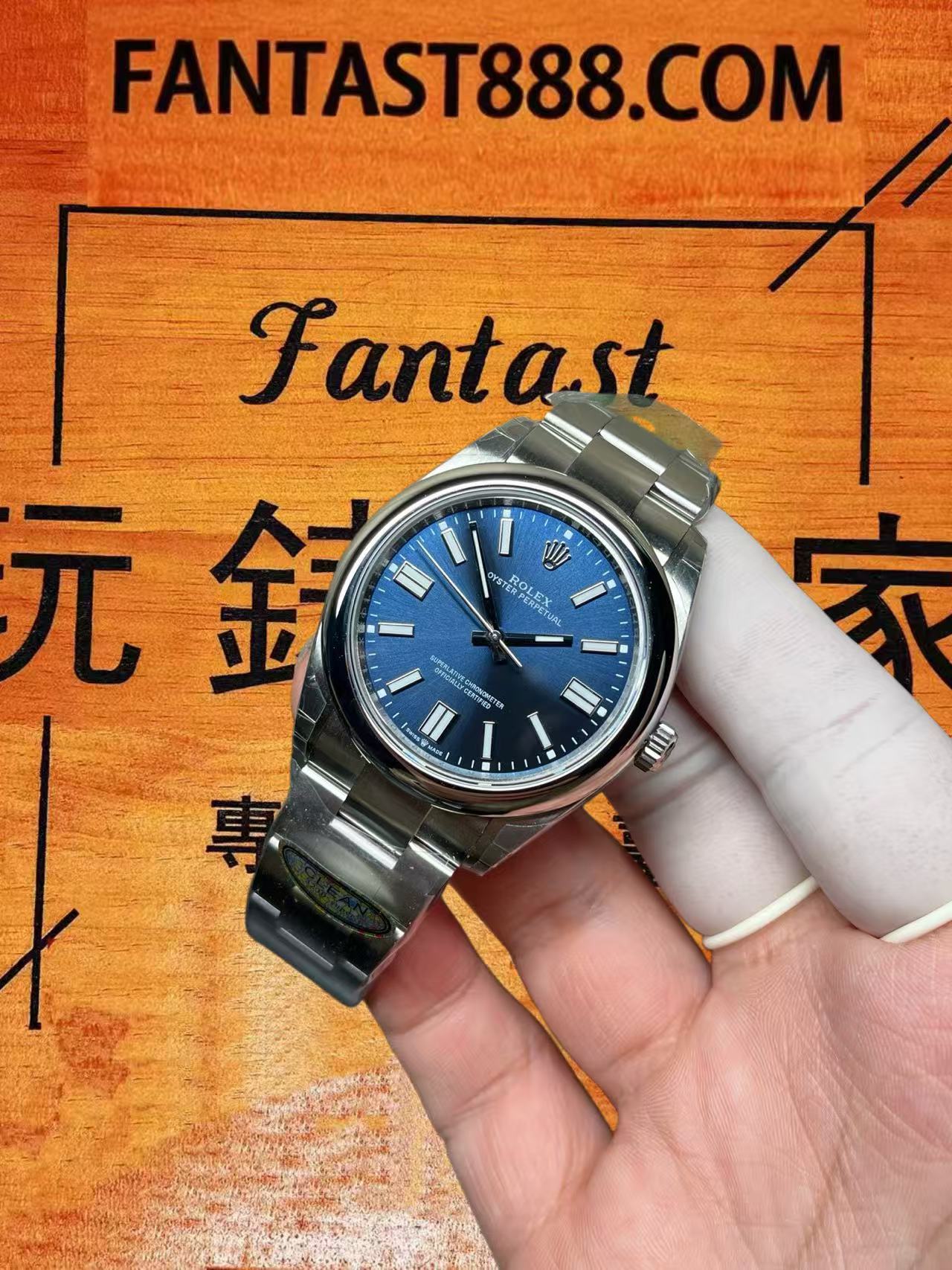 我們透過近距離畫面仔細觀察。此莫蘭迪色系的面盤並未採用放射紋路裝飾,而是呈現純淨統一的藍色調,視覺效果相當雅致。腕錶整體的做工細節已無明顯問題,因該款式已推出多年,製作工藝相當成熟。錶殼造型、拋光光澤以及錶帶的拉絲質感均表現出色。錶扣的開合手感亦十分順暢。