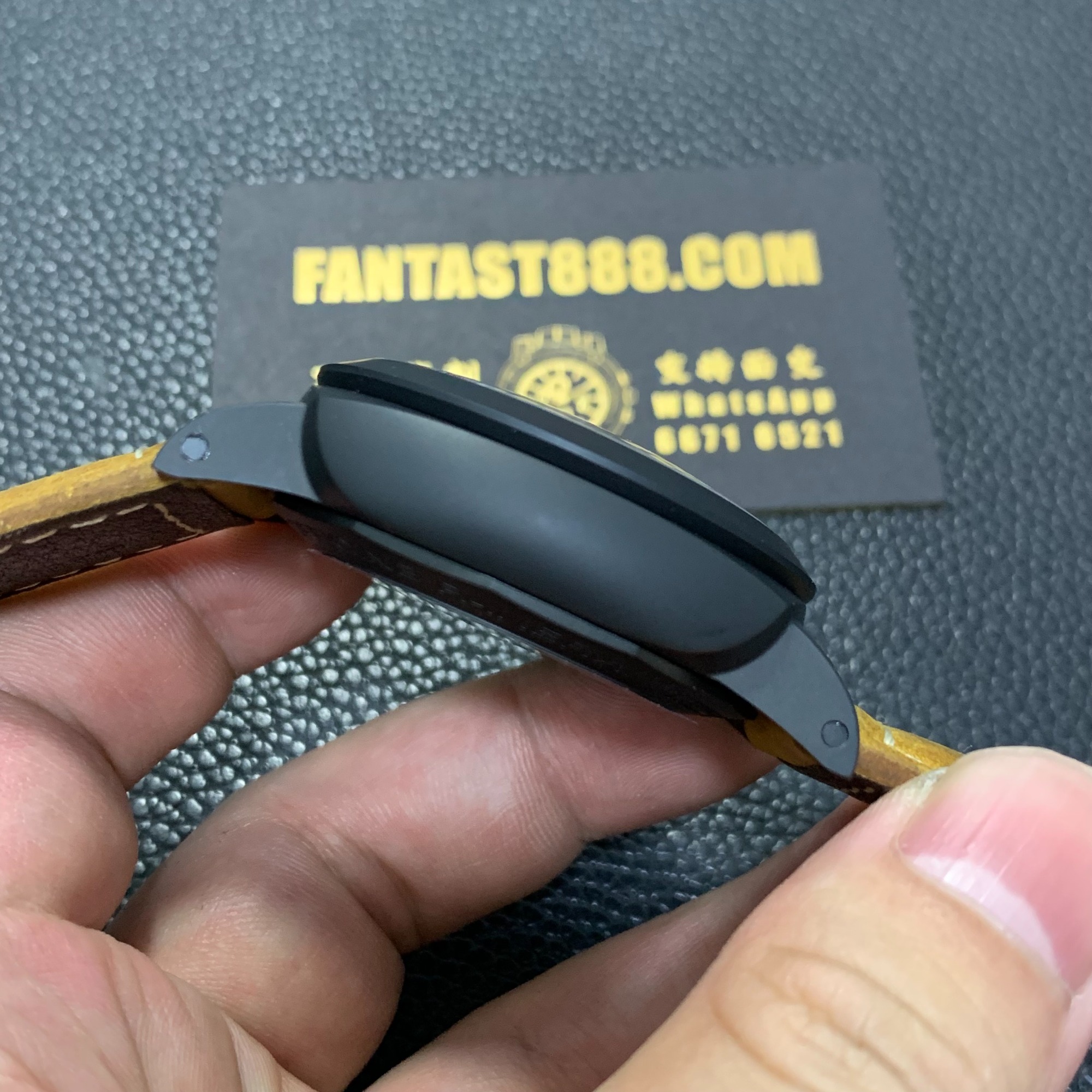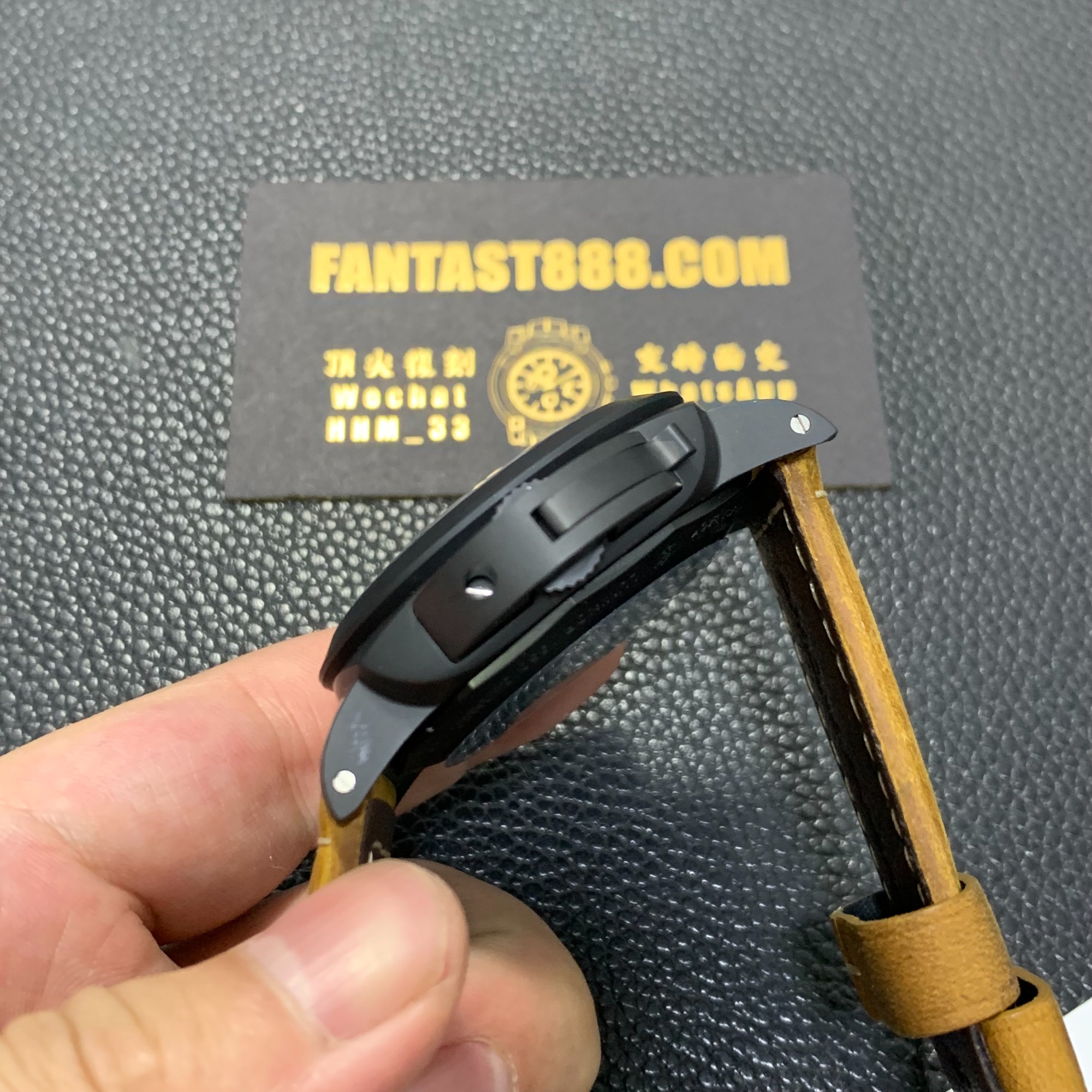 VS廠沛納海LUMINOR 1950系列PAM01441復刻手錶是一款全陶瓷製作的手錶,從錶殼、錶底、護橋、表冠到扣都採用陶瓷材料。陶瓷材質不易花,不易舊,而且更堅韌。此款手錶的陶瓷表面呈現啞光效果,不會留下指紋印記。陶瓷的硬度是不鏽鋼的五倍,不會留下任何痕跡,手錶能夠一直保持良好的品相。此外,手錶的大護橋能夠全方位地保護表冠,不會受到任何損害。表冠護橋上刻有「REG」和「TM」字樣,代表此手錶屬於Luminor 1950系列,是其專屬標誌。手錶的錶殼尺寸為44毫米,看起來非常大,但對於風格堅毅的沛納海來說,這是正常的尺寸。手錶的面盤上最引人注目的是9點鐘位置的藍色小秒針,以及金色時針分針和金色小時刻度,形成了一種撞色效果。