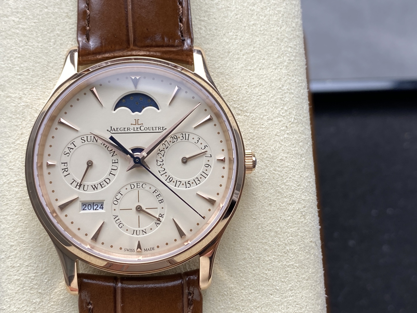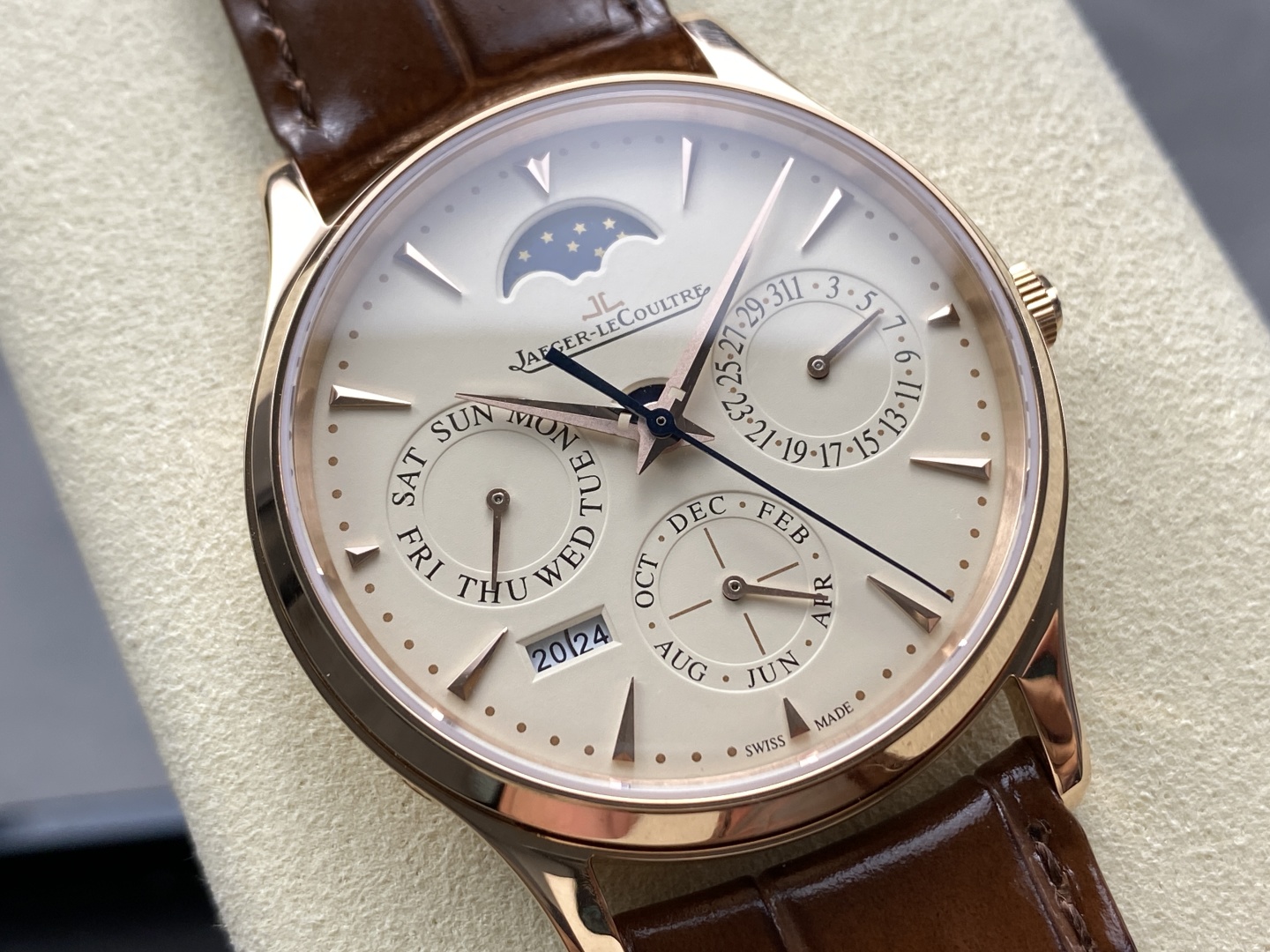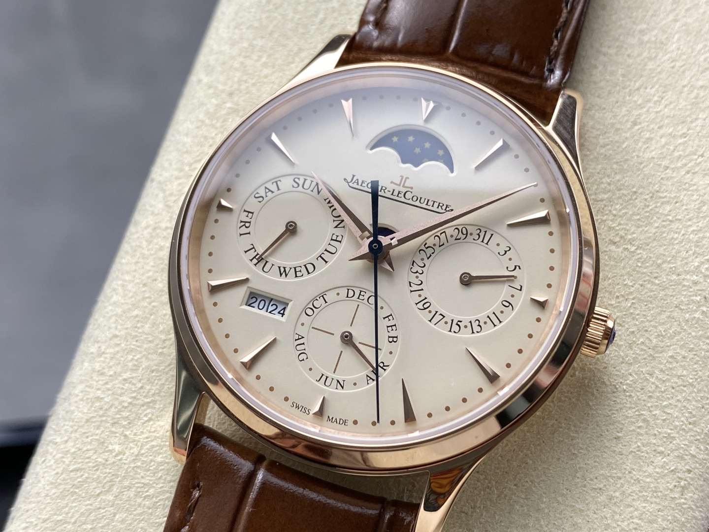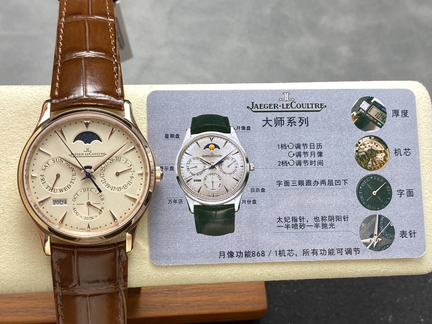 奇異博士同款積家大師萬年曆腕錶,39mm超薄設計,搭載全功能Cal.868/1機芯復刻,融合精湛工藝與隽永美學,適合高端正裝需求,香港及台灣高仿市場熱銷款。